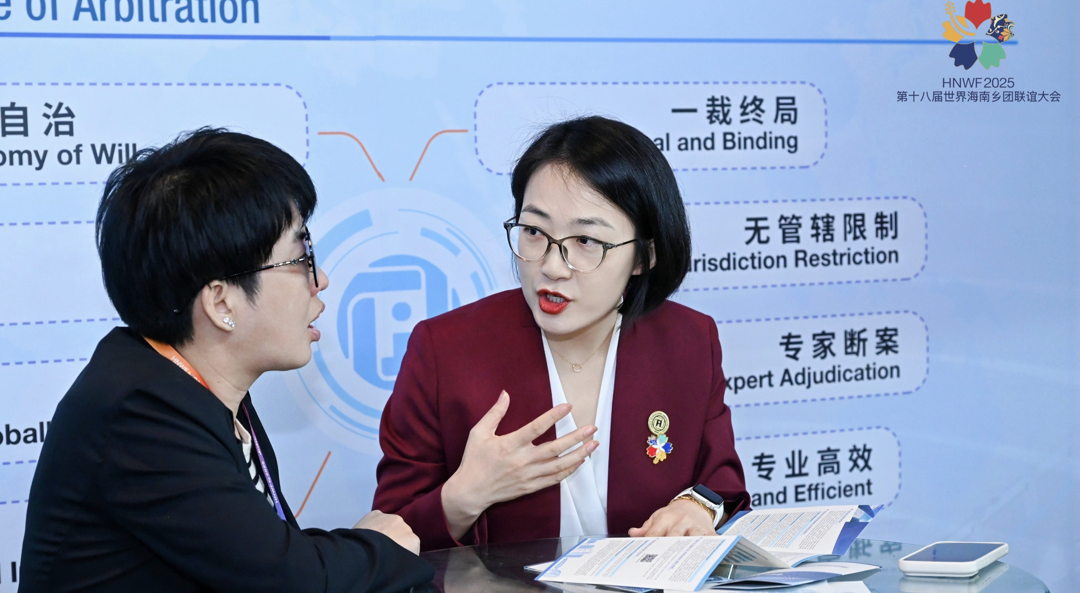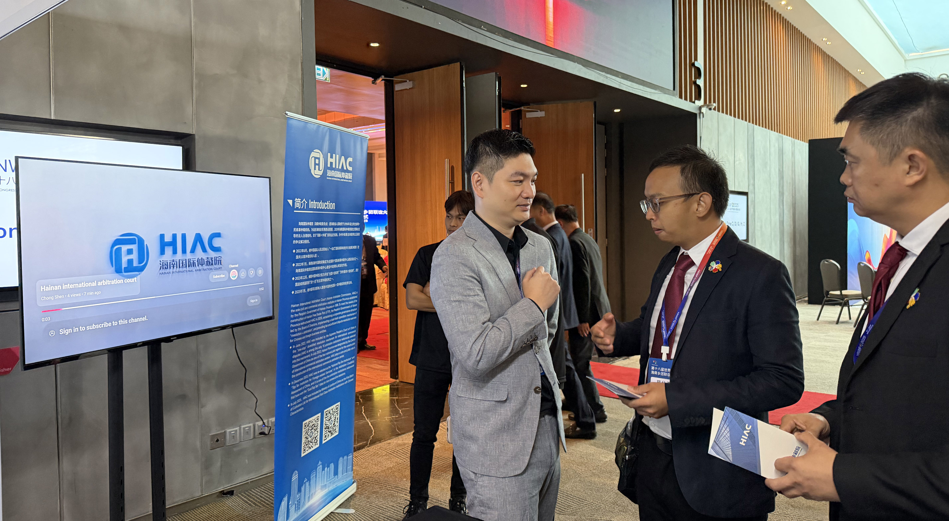 大会期间,海南国际仲裁院特设展区,展示海南国际仲裁院机制优势和公信力建设成果,工作人员在活动现场向来自世界各地的琼籍人士和企业代表介绍海南国际仲裁院发展情况及商事仲裁解决跨境经贸争议的独特优势,并详细讲解仲裁条款约定、仲裁程序推进等实务操作。现场咨询人数众多,反响热烈,工作人员应接不暇。众多参会代表纷纷表示,此次参会,不仅感受到了家乡日新月异的变化,看到了海南自贸港建设带来的巨大商机,更学习到关于仲裁制度的知识,了解到专业高效的自贸港仲裁服务为商事交易活动安装了“定盘星”,为贸易投资保驾护航,极大地增强了侨商侨胞回乡投资兴业的信心。