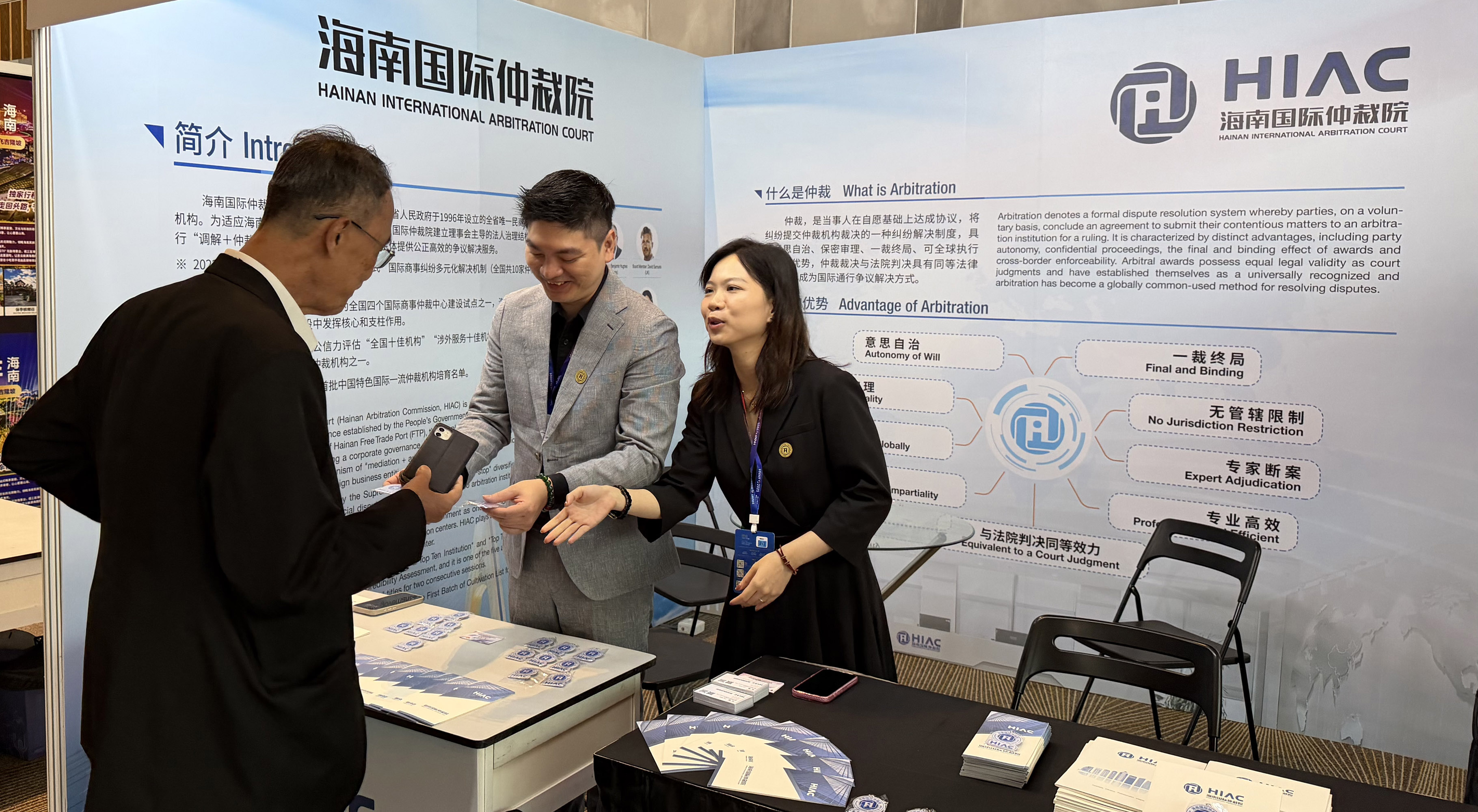 活动期间,工作人员发放宣传资料两千余册、接待咨询千余次,并深入各展位走访参展企业,向参展企业介绍仲裁制度及海南国际仲裁院基本情况,推荐企业选择海南仲裁化解纠纷。