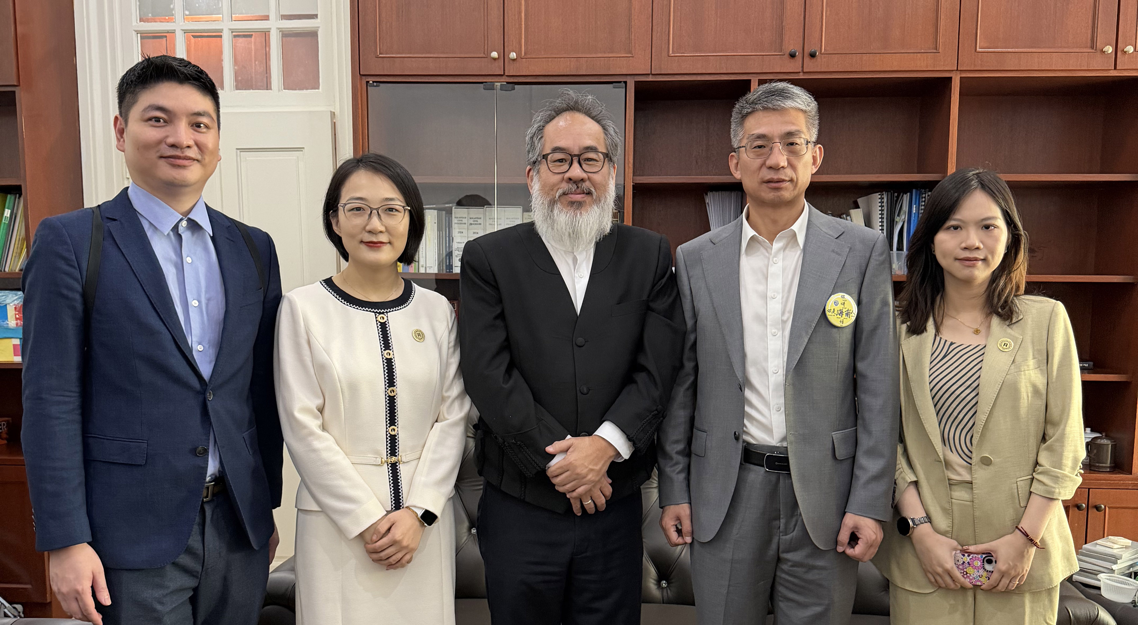 中国侨联副主席、海南省侨联主席梁谋(左三)与马来西亚海南会馆联合会总会长杨克浩(右三)到访我院展区进行交流